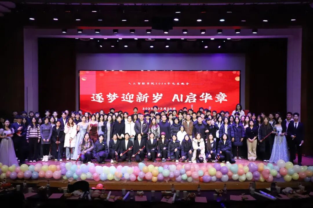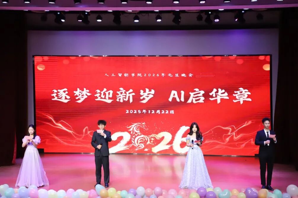 12月22日晚,人工智能学院“逐梦迎新岁 AI启华章”2026年迎新暨元旦晚会在畿辅会堂举行。院长李燕玲、党总支副书记吕鸿羽、副院长安雷、各专业任课老师、全体辅导员以及我院500余名学生一同定格专属于新春的美好瞬间。