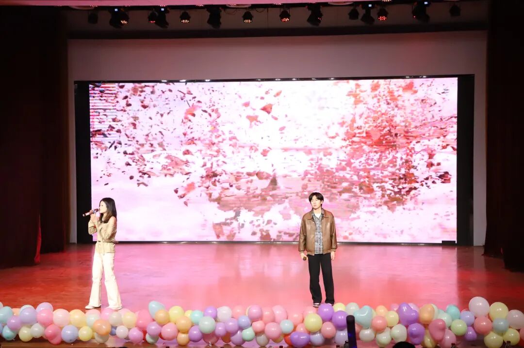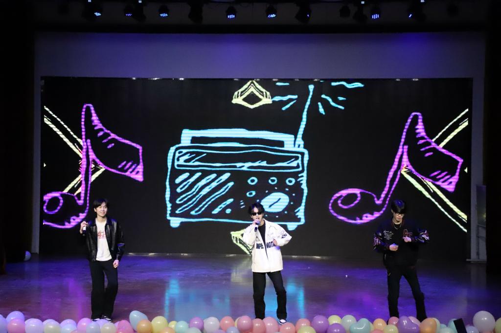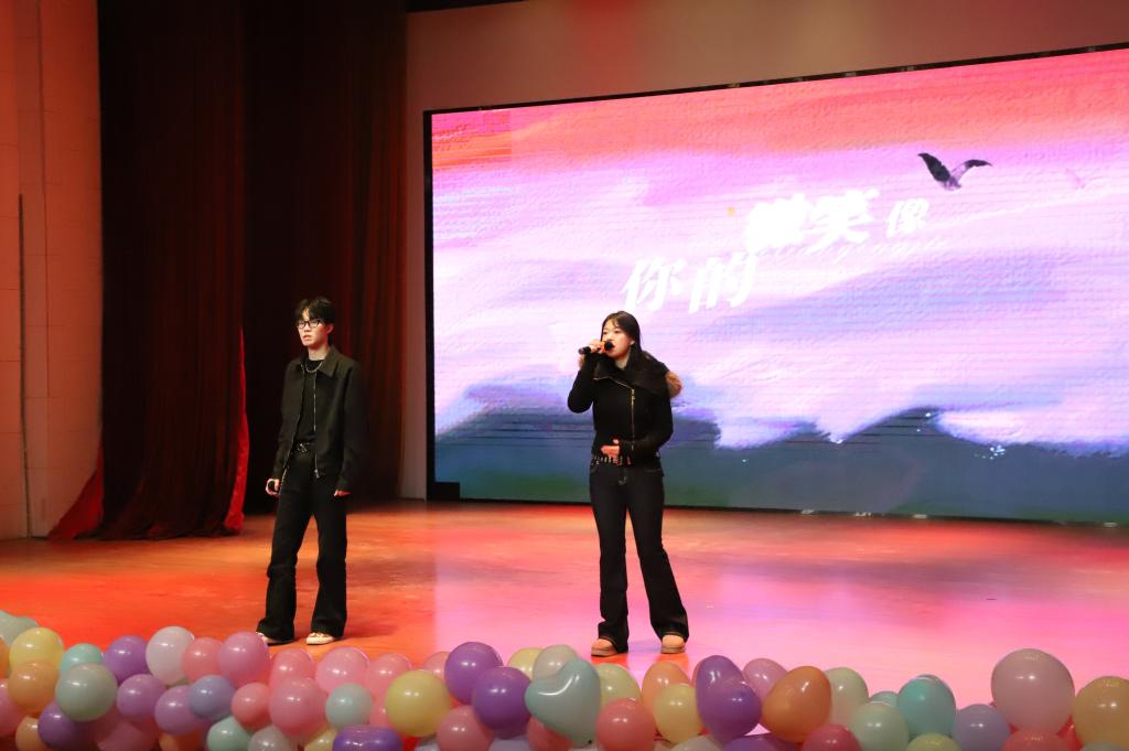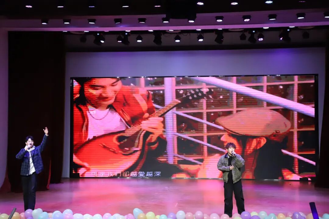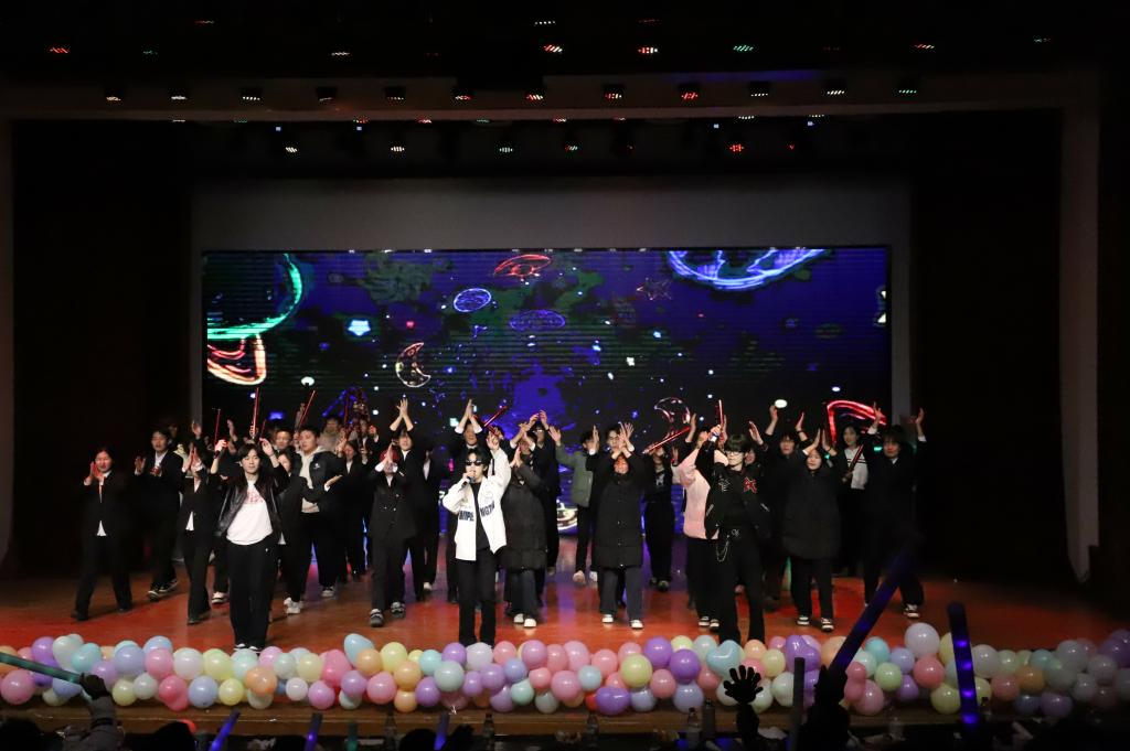 晚会尾声,赵子涵、刘淯铭、刘子宽带来合唱《你可以慢点走》,温柔的歌声缓缓响起,舒缓的旋律与治愈的歌词交织,让现场满是温情,三位演唱者用细腻声线将美好期许融入歌声。随后,同学们带着热忱登场,为这场视听盛宴再添温馨一笔,也让大家带着这份美好,奔赴新的一年。